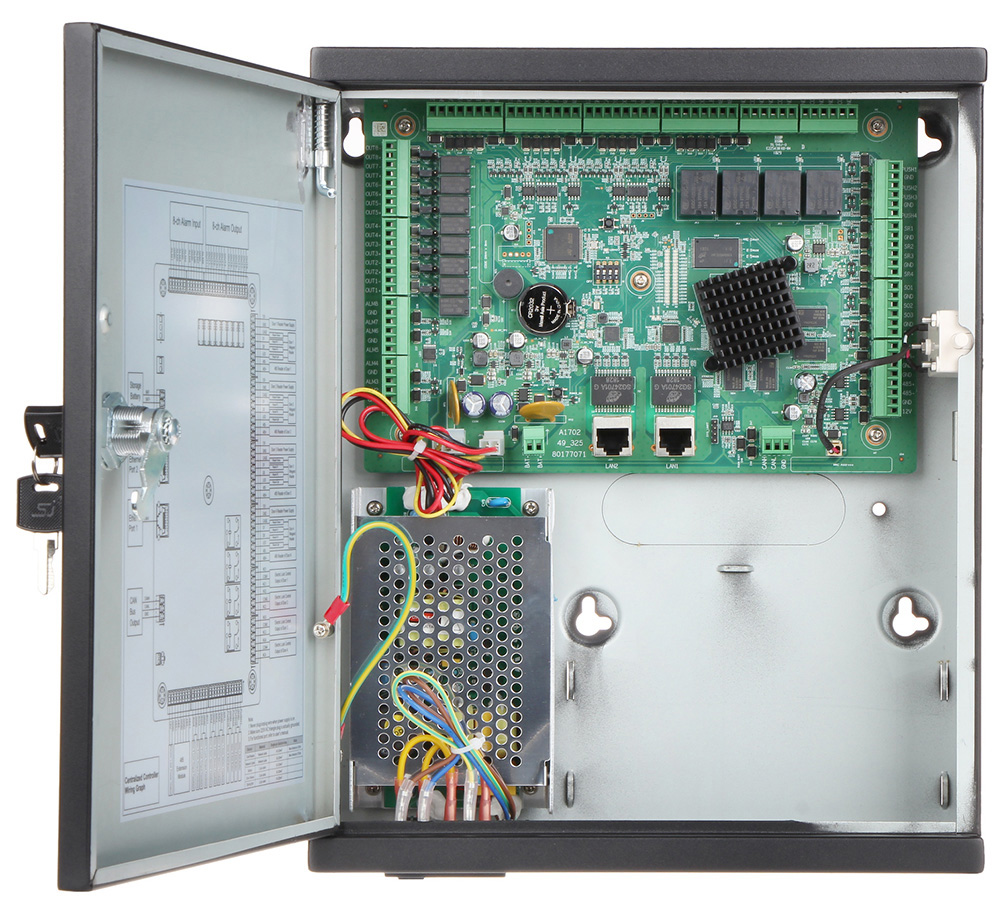 Master kontroler za sistem kaskadnog povezivanja dodatnih kontrolera preko CAN bus protokola; Podržava proširenje do 16 slave kontrolera; Mrežni kontroler za 4 čitača (4 vrata jednostrano) u metalnom kućištu sa napojnom jedinicom, punjačem i mestom za akumulator; Za Wiegand/RS485 čitače; Dual-core ARM Cortex A9@1.1 GHz CPU; 256MB RAM; 20 ulaza ( stanje vrata x 4, stanje brave x 4, REX x 4, alarm x 8); 12 releja (brava x4, alarm x8); Podržava do 200,000 kartica; Memorija 150,000 događaja; Do 128 vremenskih rasporeda; Anti-pass back, Multi-interlock, Multi-card unlock funkcije; RJ45(10/100M), CAN bus i RS485 interfejs; Radna temperatura -30°C-+60°C; Dimenzije 270 x 330 x 90mm; Masa 2kg; Potrebno napajanje 220VAc; Nazidna montaža.