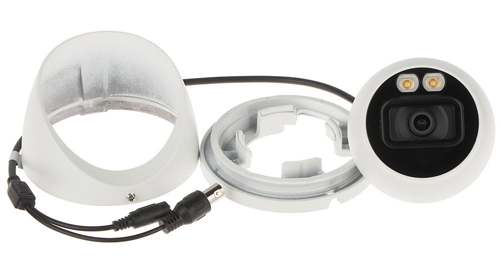 4u1 5MP eyeball Full Color kamera; Lite serija; Bele LE diode 40m; Metalno kućište; 2.8mm objektiv; Mikrofon; IP67. 4u1 (analogna, HDCVI, AHD, TVI) 5MP Bullet Full Color kamera. 5 Megapixela CMOS. Starlight. Efektivni broj piksela 2880(H)×1620(V). Rezolucija / frame rate 5M@25 fps. 4M@25 fps, 1080p@25 fps. 2.8mm F1.0 fiksni objektiv, horizontalni vidni ugao 112°. Opciono 3.6mm F1.0 fiksni objektiv, horizontalni vidni ugao 88°. Osetljivost 0.001Lux/F1.0, 0Lux (belo svetlo uključ.). Bele LE diode dometa cca. 40m. Inkorporiran mikrofon. WDR 120dB, BLC, 3D DNR, HLC-Pro, OSD. Izbor moda rada putem UTC OSD kontrolera ili sa XVR uređaja. Dimenzije φ106.0mm × 93.6mm. Masa 460g. IP67 sertifikovana. Radna temperatura -40°C~+60°C. Napajanje 12VDc ±30%/6.4W. CE (EN55032, EN55024, EN50130-4,EN60950-1).