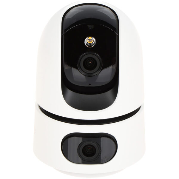 IP WiFi Dual PT IC kamera 3MP+5MP; Ranger Dual; IC 15m + beli LED; Imou Sense; Mikrofon; Zvučnik; MicroSD. IP WiFi Dual 3MP fiksna+5MP PT kamera, IC 15m (fiksni i PT) + beli LED (PT). 1/2.8” (fiksni), 1/3″ (PT) CMOS progresivno skeniranje. Efektivni broj piksela 2304×1296 (fiksni), 2880×1620 (PT). Fiksni objektiv 3.6mm, vidni ugao 87° horizontalno (fiksni i PT). 8x digitalni zum. Opseg horizontalne rotacije 355°, vertikalne 0~90°. H.265/H.264 kompresija, Do 15fps u svim rezolucijama. 4 režima rada (IC, kolor, pametni i isključen). Inkorporiran mikrofon i zvučnik, dvosmerni audio. Detekcija pokreta, detekcija ljudi, detekcija kućnih ljubimaca (Imou Sense). Detekcija promene nivoa zvuka. Pametno praćenje. Privacy mask – maskiranje sočiva. Taster za reset. RJ-45 (1x100Mbps) mrežni port. Wi-Fi 6: IEEE802.11/b/g/n, 2.4 GHz, dometa do 50m na otvorenom. Interoperabilnost ONVIF. MicroSD (do 256GB). Podržava skladištenje na NVR, Cloud ili lokalno (uz Micro SD karticu). ImouLife aplikacija za iOS, Android i Windows. Montaža portalno ili na plafon. Kućište od plastike. Radna temperatura -10°C~+45°C. Dimenzije 82.2mm × 82.2mm × 115.4mm, masa 225g. Napajanje 12VDc <5.7W. U kompletu sa napajanjem 220VAc/12VDc 1.5A, nosačem, vodootpornim konektorom i montažnim priborom. CE sertifikovana.