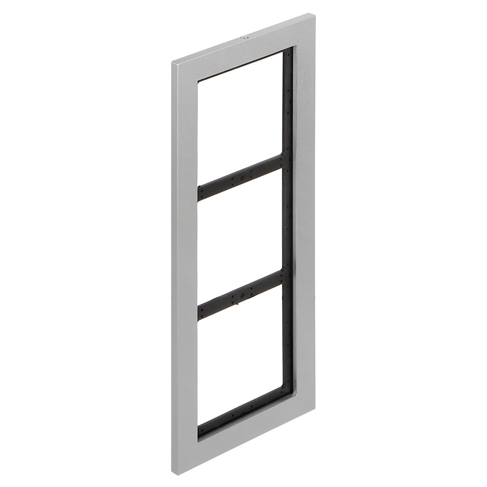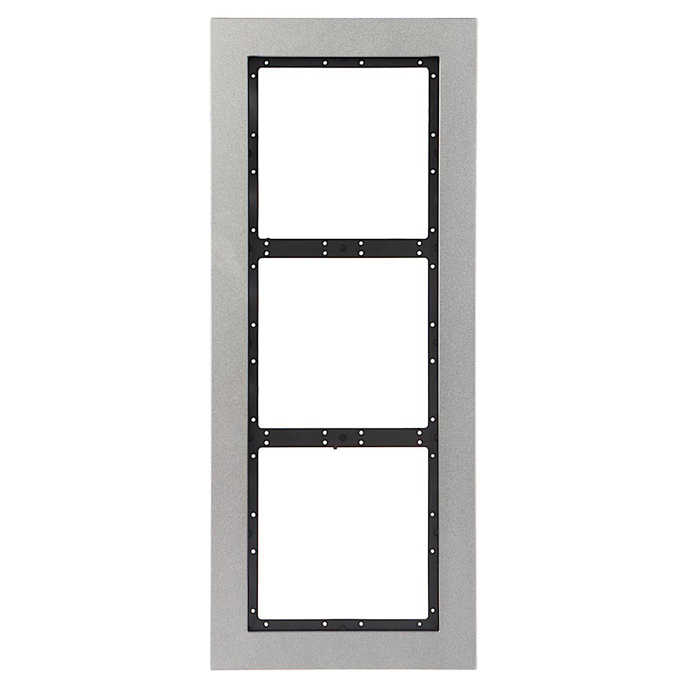 Ram za montažu 3 modula. Moguća horizontalna ili vertikalna montaža modula, kutije i rama. Za pozivne panele serije 4000. Dimenzije 140mm×240.20mm×7.0mm. Od aluminijuma.