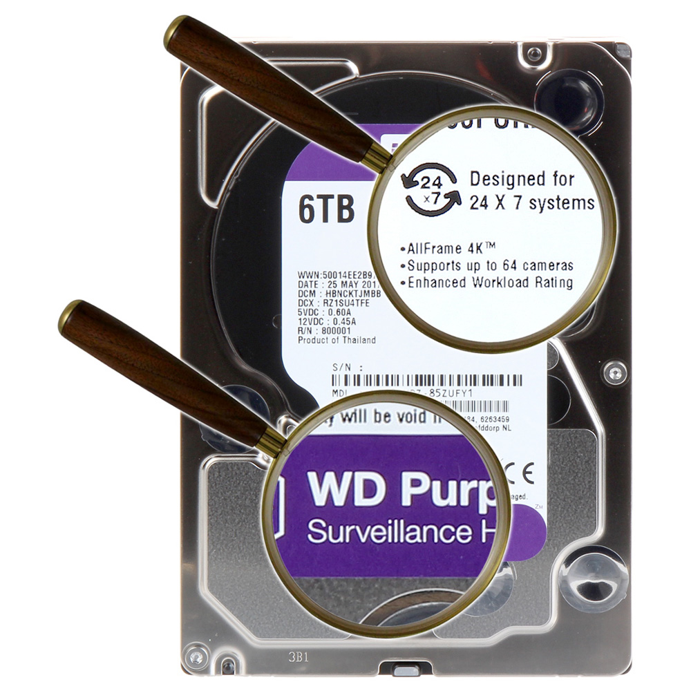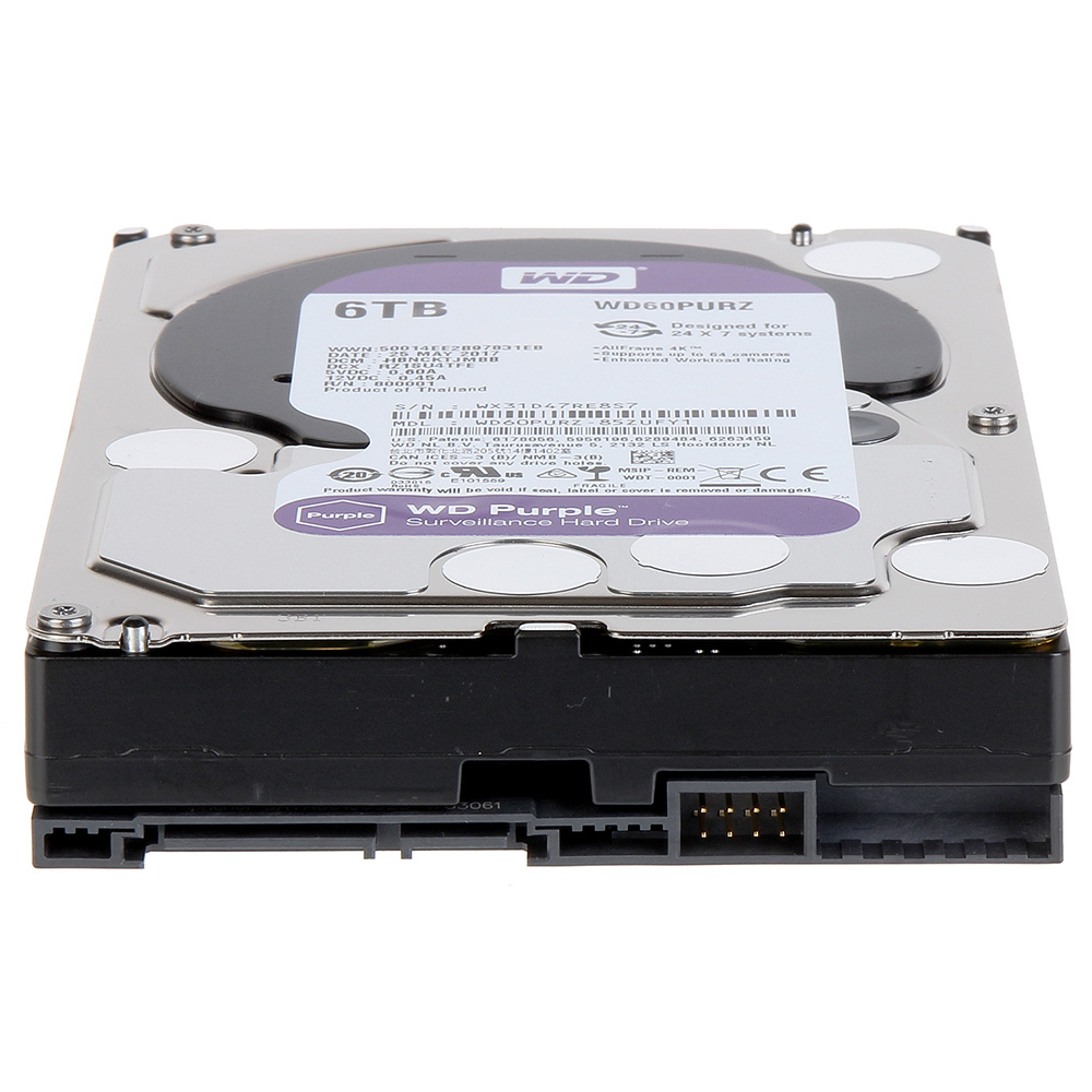 WD Purple diskovi za video nadzor su napravljeni za 24/7 non-stop nadzor u sigurnosnim sistemima visoke definicije koji koriste do osam hard diskova i do 32 kamere. Ekskluzivna AllFrame tehnologija radi sa ATA strimovanjem da smanji greške pikselizacije i prekide video snimka koji se pojavljuju kada se desktop klasa hard diskova greškom koristi kao skladište podataka u sistemima nadzora. Parametri: Model WD60PURX. Kapacitet 6TB. Povezivanje SATA3. Tip Interni. Broj obrtaja u minuti 7200. Format 3.5”. Bafer 64MB.