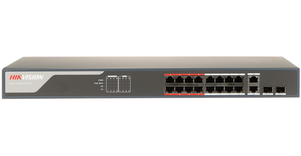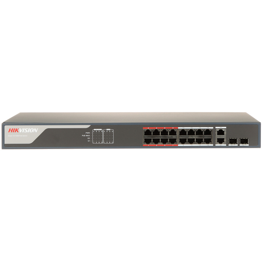 16 x100 Mbps PoE RJ45 portova IEEE 802.3af/at, 2 × gigabitna combo porta. Switching Capacity: 7.2 Gbps. Packet Forwarding Rate: 5.3568 Mpps. MAC Address Table: 16 K. Standard mode (default), Extend mode. Interna keš memorija : 4 Mbits. Max. Port Power: 30 W. PoE Power Budget: 230 W. Težina: 2,59 kg. Dimenzije: 440 mm × 44 mm × 220.8 mm. Radna temperatura:-10°C to 55°C. Napajanje: 100~240 VAC, 50/60Hz, Max. 2.5 A.