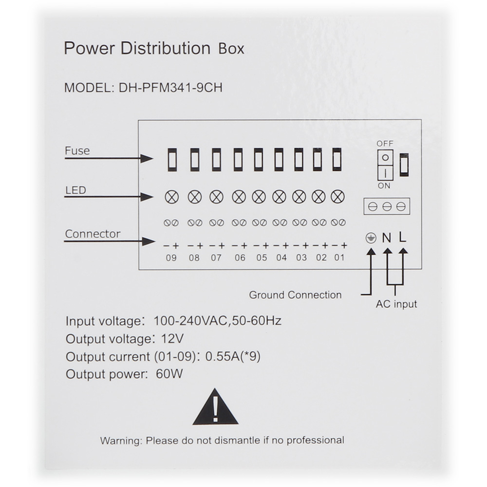 Napojna jedinica 90~260VAc/12VDc 5A; 9 izlaza sa osiguračkom zaštitom; Zaštita od prenapona, kratkog spoja i preopterečenja; LED indikacija prisustva 220V i LED indikacija rada pojedinačnih izlaza; Do 2.5A po izlazu; U metalnom kućištu 165 x 165 x 50 mm; masa 0.9 kg,