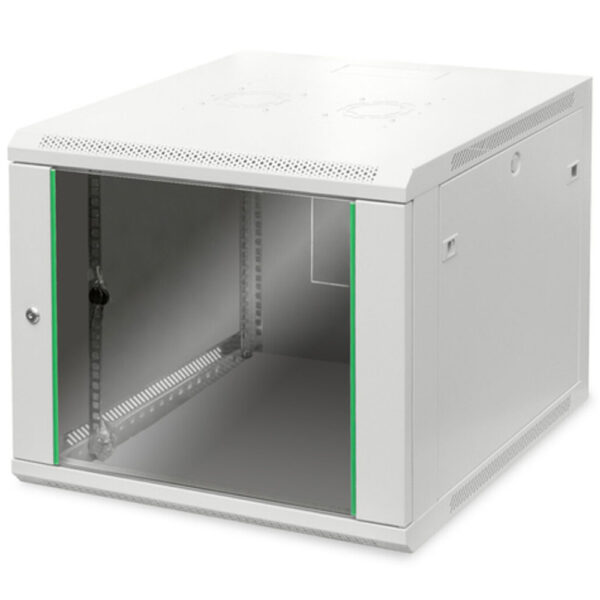 Rek orman za zidnu montažu 7U 416.15x600x450 mm Rek orman za zidnu montažu, predviđen za montažu 7 uređaja od 19” standarda (483mm), napravljen od tvrdog metala sa oplatom, mogućnost skidanja stranice, slot za aktivne ili pasivne ventilatore, otvori za ventilaciju, IP20 standard, staklena zaštitna vrata sa bravom, otvori za kablove.